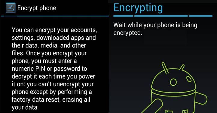 The application allows you to encrypt accounts, apps, media, settings, and so on. Once you have started the process, the phone will display a progress bar, and will restart a few times. Let it do its thing until the process is over.